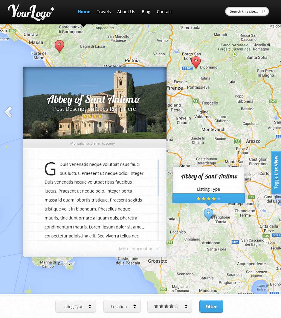 Andando al link qui in basso, potete apprezzare 4 screenshot di anteprima: la Home, in due versioni, senza e con la barra di destra, con l’elenco dei posti evidenziati sulla mappa, la pagina degli itinerarie e il blog. Potete passare dall’uno all’altro ciclicamente, facendo click sull’immagine stessa. Non è un vero e proprio sito navigabile. Sono solo immagini, con testo di esempio Lorem Ipsum, ma essendo in scala 1:1, si può apprezzare bene il forte l’impatto visivo, il carisma e l’originalità, che un layout del genere può conferire al vostro sito internet. Spero vi piacciano!